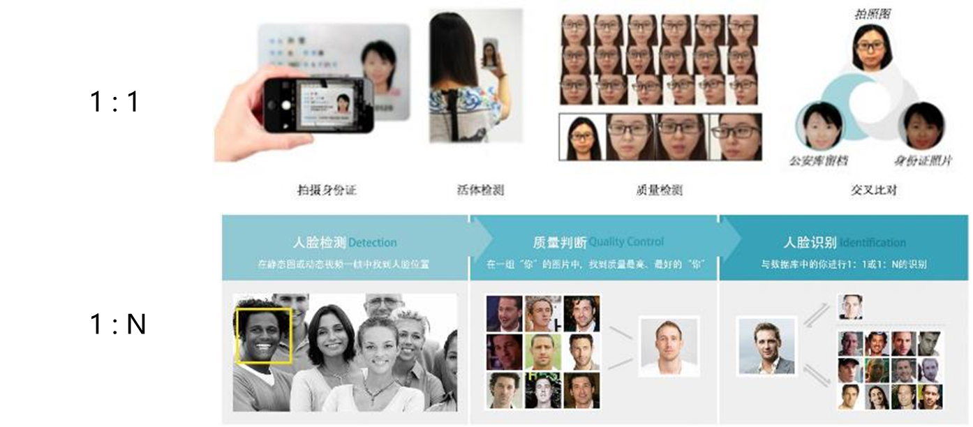 從技術上講,人臉識別類型主要分為1:1和1:N,如下圖所示。