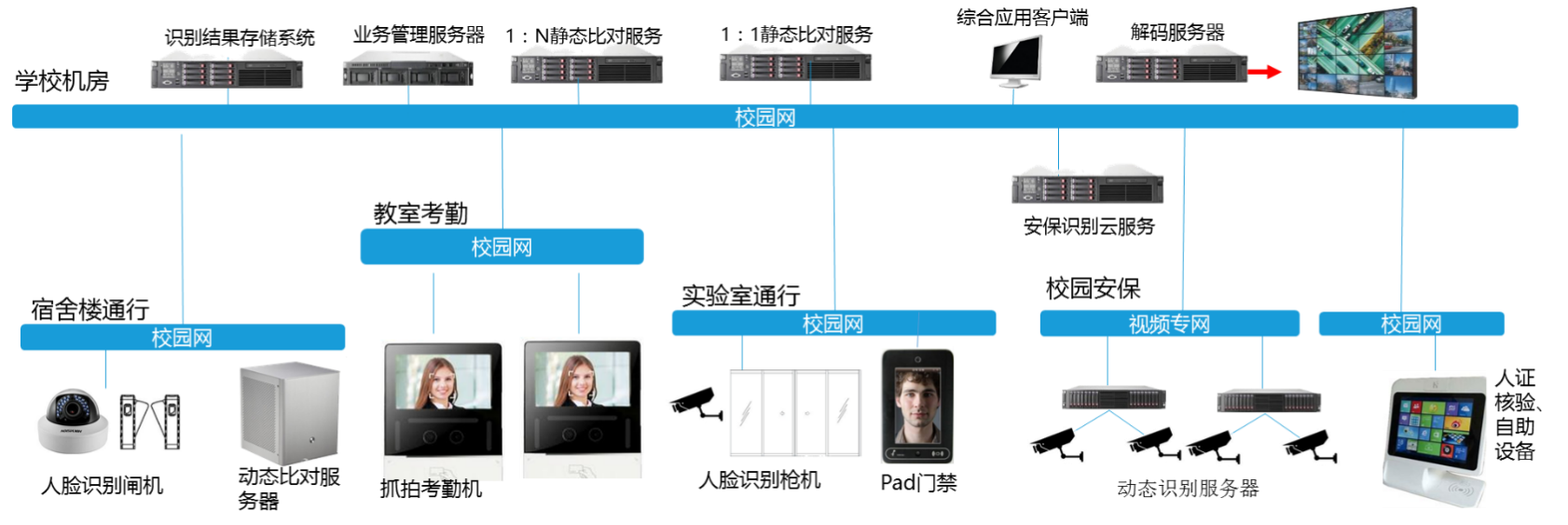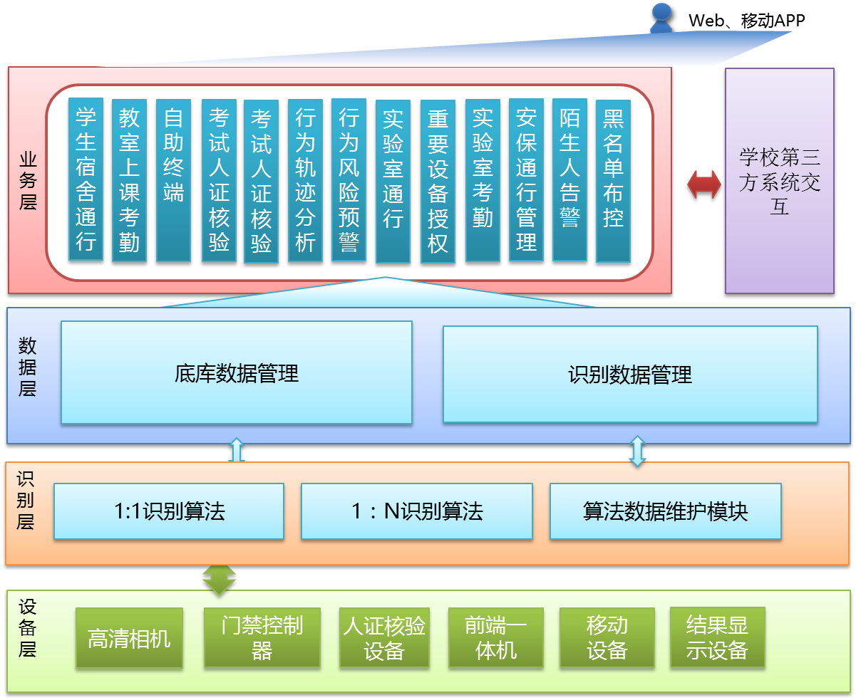 借助于云計算、大數據、物聯網、移動互聯網、人工智能技術等信息技術的發展,智慧校園建設也被賦予了更多的含義,更加豐富的數據獲取途徑、更智能化的分析方法使得精細化和人性化的校園管理成為可能。而“人”這一最重要的因素,是智慧校園建設中最重要的課題。以往的數字化校園建設中,通常使用校園卡作為學生、教工的數字化標簽,比如刷卡通行、刷卡簽到、刷卡消費等,通過刷卡信息來獲取、分析、引導人的行為,從而實現精細、人性化的管理。卡是一種成本低、效率高、需要配合的方式, 目前已經得到了大面積應用,也為智慧校園建設積累了大量的數據和經驗。但是卡本身無法和人進行有效綁定,丟卡、忘帶卡等現象帶來的不便和安全隱患時有發生。