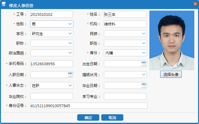 人事信息:【管理員】可以維護維人事信息,包括所屬單位、工號、姓名、照片、身份證、聯系方式等信息,對信息進行添加、刪除、修改等操作。