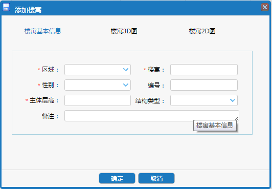 【管理員】可以維護學生宿舍樓的信息,包括樓宇名稱、編號、所住學生性別、所屬區域、樓宇結構類型、層高等,對其進行添加、刪除、修改等操作,并可以上傳該樓宇的2D、3D圖,供學生可視化查看該樓宇信息。