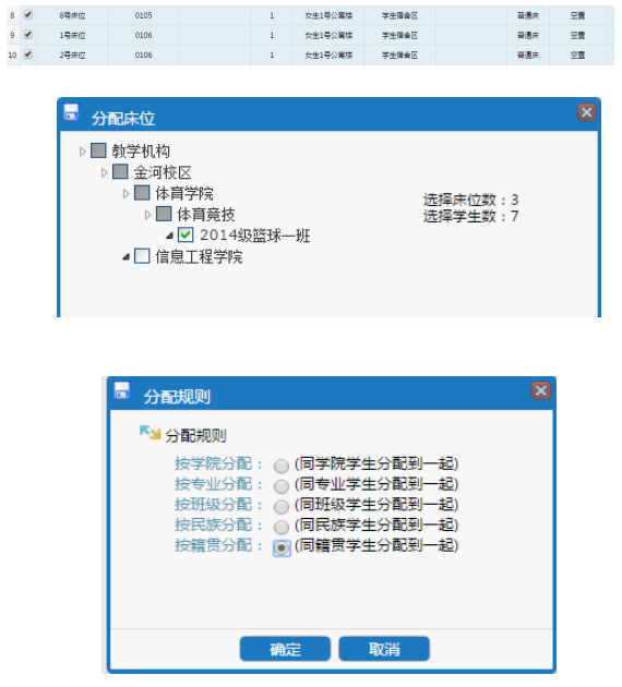 按床位分配:選擇性別,查詢床位,選擇目標床位后選擇要分配床位的學生(學生數不大于床位數),而后選擇分配床位的規則,按照分配規則給學生分配床位