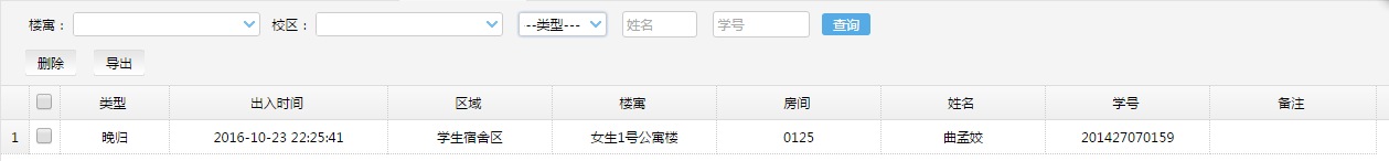 對于晚歸、未歸學生生成查夜名單,可以按宿舍樓、院系、姓名、學號進行查詢,并可以導出,以供管理人員查看