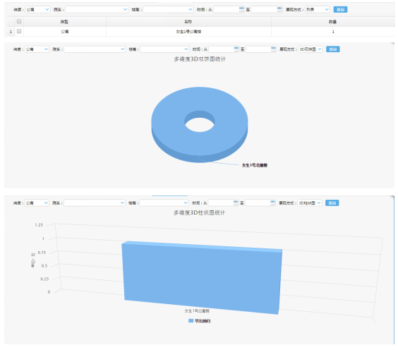 以樓宇、院系、專業、班級等維度,查詢早出晚歸學生數量,以列表、3D餅狀圖、3D柱狀圖的形式進行展示