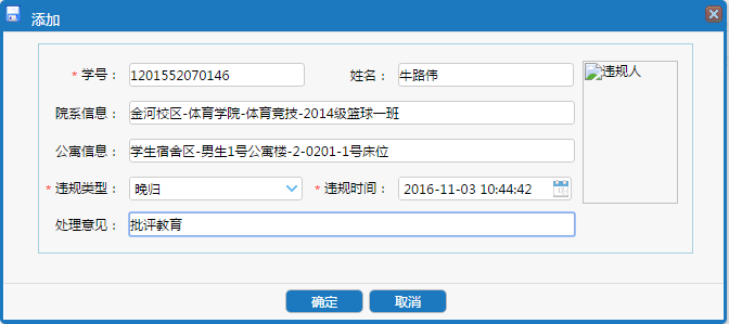 對于違規的學生進行處理,填報違規類型、違規日期,處理意見,生成處理記錄