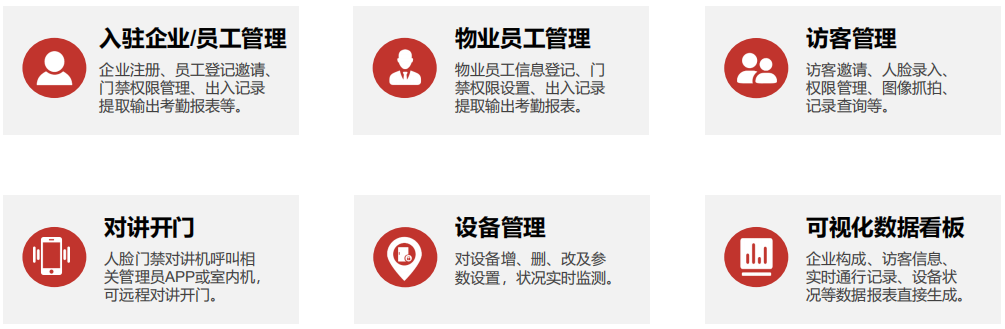 ? 產品:基于智慧園區人臉門禁云平臺(以PC端瀏覽器、APP、小程序為功能載體),聯通各智能硬件終端(人臉門禁通道機、人臉門禁考勤機和人證核驗機等),實現人臉通行、人臉考勤、人證核驗、員工/訪客管理、權限管控、設備管理等一體化智能應用及高效管理,全面滿足各出入口的管控需求。